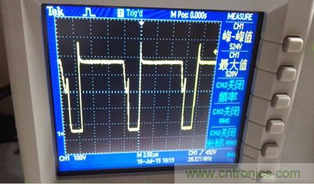 6、功率開關(guān)管采用TO-220塑封12N65的場(chǎng)效應(yīng)管ID太大12A。一方面提高了成本,造成浪費(fèi);另外一方面因?yàn)殚_關(guān)管的結(jié)電容太大Ciss為2290PF,會(huì)造成驅(qū)動(dòng)不足的現(xiàn)象反而會(huì)影響驅(qū)動(dòng)轉(zhuǎn)換效率,實(shí)際測(cè)量開關(guān)管最高峰值電壓才524V。因此建議設(shè)計(jì)開關(guān)管用5N60或者7N60的MOS管。