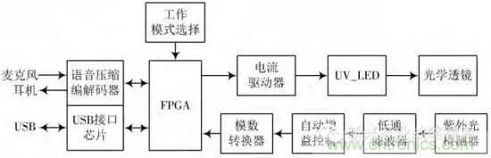 系統(tǒng)的核心部件是UV?LED和紫外光檢測(cè)器,此外還有一片可編程邏輯陣列(FPGA),外接語(yǔ)音壓縮編解碼芯片和USB接口芯片,分別用來(lái)支持語(yǔ)音和數(shù)據(jù)的傳輸,如圖1所示。