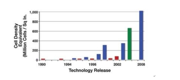 圖2顯示了Fairchild公司≤30V的N溝道MOSFET單元密度的進步。每個條形都表示新的工藝進步??梢钥吹剑谧罱氖曛?,單元密度從3200萬單元/平方英寸增加到現(xiàn)在的10億單元/平方英寸。