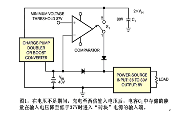 應(yīng)記住,電容存儲的能量以指數(shù)增加,而電容的電壓線性增加。倍增器把C1充電至兩倍輸入電壓或至少為80V。即便假定每10s出現(xiàn)一次5ms電壓不足,用于充電200mF的電流仍僅約為3mA。比較器觀察輸入電壓,并且一旦它降至低于37V,開關(guān)S1就會關(guān)閉,而來自C1的能量向“磚塊”電源放電。