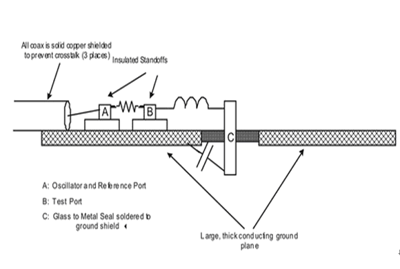 測試電感性能的最有效方法就是將被測試電感放置在最終開關(guān)電源電路上,然后對此電路的效率進行測量。但是,這種測試方法需要有最終電路,不易采用?,F(xiàn)在,有一種相對簡單的測試方法,可以在設(shè)計開關(guān)電源前對電感的磁芯損耗進行測試(在其設(shè)定的開關(guān)頻點上)。首先,將磁芯串連放置在低損耗電容介質(zhì)上(比如鍍銀云母)。然后,用一系列共振模驅(qū)動。其中介質(zhì)的電容值需要與被測電感的開關(guān)頻率一致。最后采用網(wǎng)絡分析儀來完成整個測試過程(信號發(fā)生器加上一個射頻伏特計或者功率計也可以完成測試)。測試設(shè)備的結(jié)構(gòu)如圖2所示。