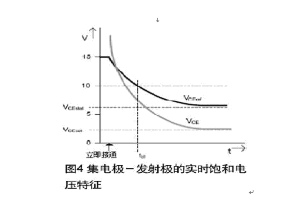 使用信號變壓器(脈沖變壓器)不僅可以提供高質量的電氣隔離,它在原邊與副邊間還有很高的dv/dt(50kv/us)。與光耦構成的驅動電路不一樣的是,信號變壓器可靠性好,號電路通道被互鎖,直到有復位脈沖對該電路進行復位。在IGBT退飽和監(jiān)視中,必須考慮它的實時飽和電壓特征。在IGBT開通的最初幾個微秒,集電極-發(fā)射極電壓遠高于穩(wěn)定后的VCEsat值。因此監(jiān)測電路的響應特征在消隱時間內(圖4)必須與VCEsat特征圖一致。