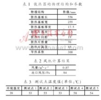 軟件計算結(jié)果:表1為散熱器的物理結(jié)構(gòu)和參數(shù);表2為風(fēng)機(jī)的風(fēng)量和風(fēng)壓計算結(jié)果;表3為散熱器上選擇的五個測試點的溫度值。