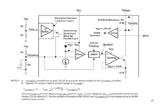 當(dāng)該特定通道處于“關(guān)閉”狀態(tài)時(shí),經(jīng)過編程的 VPEAK(X) 值被反映在 VCOMP(X) 上。如果一個(gè)特定通道被開啟,那么過電流檢測(cè)的參考電壓就為動(dòng)態(tài),并且用內(nèi)部 VPEAK 設(shè)置和VCOMP(X) 終端外部組件值表示。