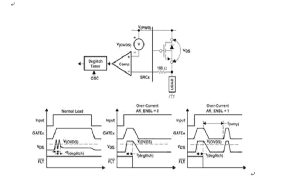 當(dāng)檢測(cè)到一個(gè)過電流狀態(tài)時(shí),通過“關(guān)閉”器件或激活將以低占空比自動(dòng)重試和 “開啟”FET 的選項(xiàng)設(shè)置,就可以對(duì) FET 進(jìn)行保護(hù)。這樣就允許系統(tǒng)不斷地檢查故障是否已經(jīng)被排除,并且不會(huì)破壞 FET。圖3顯示了這種過電流檢測(cè)保護(hù)的原理圖。