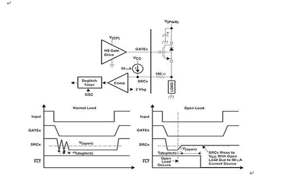在“關(guān)閉”狀態(tài)下監(jiān)控開路負(fù)載故障為系統(tǒng)提供了負(fù)載完整性信息。當(dāng)開關(guān)完全處于“關(guān)閉”狀態(tài)下時(shí),通過監(jiān)控外部功率 FET 的電源電壓,就可以實(shí)現(xiàn)對(duì)每一條通道開路負(fù)載故障的檢測(cè)。一個(gè)內(nèi)部電源激活一個(gè)流經(jīng)負(fù)載到接地的小恒定電流,并且使開路負(fù)載檢測(cè)閾值以下的 SRCx 節(jié)點(diǎn)發(fā)生偏置。