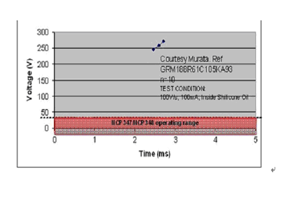 首先要檢查的是該電容的直流偏置曲線,以保證其工作時(shí)所能承受的電壓高于UVLO到 OVLO這個(gè)電壓范圍。例如,假設(shè)保護(hù)器件前方需要一個(gè)1µF的陶瓷電容。