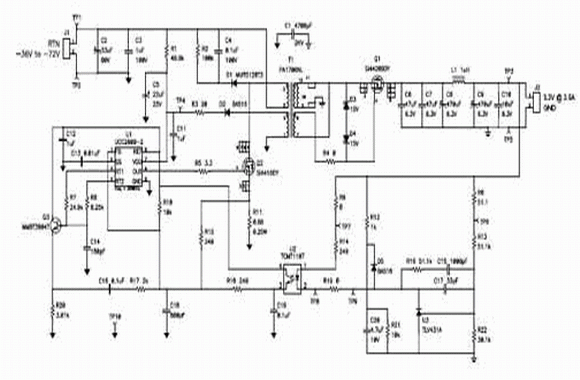 圖 3 顯示了傳統(tǒng)同步反向電源設(shè)計(jì)的完整原理圖。該設(shè)計(jì)使用了一個(gè)低成本、簡(jiǎn)化的電流模式 PWM 控制器(即 UCC2809),對(duì)電源進(jìn)行控制。除了主緩沖器以外,該電路還需要D3 和 D4 的齊納鉗位電路,以防止來(lái)自漏極電感峰值的 Q1 超高柵-源電壓。