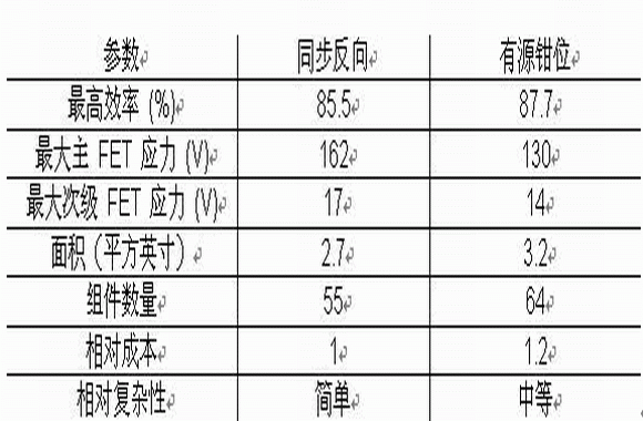 表 2 列出了對(duì)兩種同步反向電源主要部分進(jìn)行比較的總結(jié)。該表說(shuō)明了有源鉗位反向電源相對(duì)于變壓器驅(qū)動(dòng)同步反向電源在性能上的優(yōu)勢(shì)。尤其是在輕負(fù)載情況下,有源鉗位反向電源具有更低的 FET 電壓應(yīng)力及更高的效率。有源鉗位控制器 (UCC2897) 的可編程停滯時(shí)間特性(該特性可防止主、次級(jí) FET 的疊加傳導(dǎo) (overlapping conduction))有助于最小化 Q1 二次側(cè)直通損耗。這些損耗一般表現(xiàn)為可在主電流感應(yīng)電阻器上觀測(cè)到的一個(gè)大電流峰值,且經(jīng)常會(huì)導(dǎo)致輕負(fù)載抖動(dòng)的問(wèn)題。有源鉗位反向電源較低的高頻振鈴會(huì)產(chǎn)生更少的 EMI 及一個(gè)全局范圍內(nèi)更低噪聲的電源。由于漏極電感對(duì)有源鉗位電路性能的影響較小,因此,盡管同步反向電源并不是一無(wú)是處,但比起帶有同步反向的情況,高頻操作更有可能實(shí)現(xiàn)。在這兩個(gè)示例電路中,與有源鉗位反向電源相比,傳統(tǒng)的同步反向電源可將 PWB 面積、組件數(shù)量和成本上降低大約 15%~20%。這是一款容易設(shè)計(jì)和(可論證性地)理解的更簡(jiǎn)單的電路,雖然如此,但還是要考慮到其在性能上的一些不足。那么,您應(yīng)該在什么時(shí)候選擇一個(gè)有源鉗位反向電源呢?如果輸出功率較低,同時(shí)設(shè)計(jì)要求一直進(jìn)行連續(xù)模式運(yùn)行,那么有源鉗位反向電源可以實(shí)現(xiàn)高效率、低 EMI 運(yùn)行。在輕負(fù)載效率較為關(guān)鍵的應(yīng)用中,它具有一個(gè)更為明顯的優(yōu)勢(shì)。