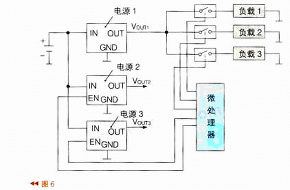 在實際應用中,往往由于電路復雜而采用電源管理IC及多個負載開關組成的負載管理系統(tǒng),如圖6所示。圖6中有3個電源,輸出不同的電壓。電源1給負載1~3供電。為了控制負載1~3的通電或失電,在電源與負載之間設了3個負載開關。電源2、電源3則由電源管理IC來控制其負載的通電或失電。