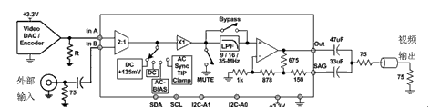 如果系統(tǒng)設(shè)計中已經(jīng)采用了THS7303或THS7313 6dB增益放大器,并采用了參考接地的DAC或編碼器驅(qū)動,那么DC輸入模式會很理想。問題在于,DAC生成的電壓有多低?如果同步信號(通常這是視頻信號中電壓最低的)電壓低于50mV,那么6dB放大器的輸出就應(yīng)生成低于100mV的電壓,由于CMOS和雙極放大器都存在晶體管飽和方面的限制,因此這對任何放大器來說都是很難做到的。