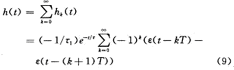 由式(8)可見,第k段的非零值時(shí)區(qū)為(kT,(k+1)T_),即各時(shí)段非零值區(qū)間互不重疊,對(duì)hk(t)關(guān)于k求和,得開關(guān)電容電路(對(duì)外)的單位沖激零狀態(tài)響應(yīng)h(t)為: