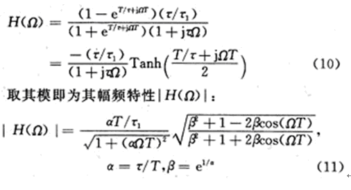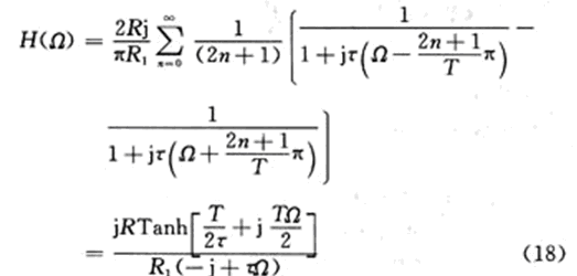 上式說明,Ie(Ω)是輸入電流頻譜I(Ω)周期延拓的組合,周期為Ω0=2π/T。各電流分量流過RC并聯(lián)支路時(shí)的電壓為相應(yīng)電流分量與RC支路阻抗(R/(1+jωτ),ω=Ω±(2n+1)π/T)的乘積,于是輸出電壓頻譜U(Ω)為:
