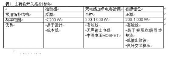 要提高主轉(zhuǎn)換器能效可以采用以下幾種方法。一是通過(guò)降低導(dǎo)通阻抗(開(kāi)關(guān)損耗較高)和/或減小初級(jí)峰值電流和均方根電流來(lái)降低初級(jí)導(dǎo)通損耗;二是考慮采用軟開(kāi)關(guān)技術(shù)降低開(kāi)關(guān)損耗;三是通過(guò)減少整流器壓降(使用低正向壓降二極管或FET整流器)來(lái)降低次級(jí)損耗;四是采用更好的磁芯材料來(lái)降低磁芯損耗。表1列出了主要軟開(kāi)關(guān)的拓?fù)浣Y(jié)構(gòu),可供設(shè)計(jì)時(shí)參考。