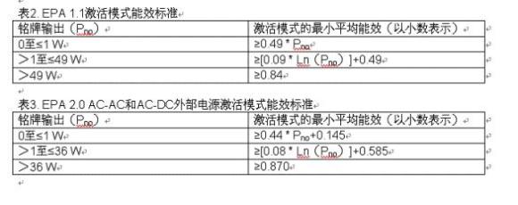 美國(guó)環(huán)保署外部電源1.1版和2.0版規(guī)范分別對(duì)激活模式能效標(biāo)準(zhǔn),以及AC-AC和AC-DC外部電源激活模式能效標(biāo)準(zhǔn)做出了規(guī)定,如表2和表3所示。
