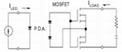 圖1表示FET型半導(dǎo)體繼電器是一種最基本的電路。該電路因輸出元件的功率MOSFET是電壓驅(qū)動(dòng)型元件,因此,由于光電二極管陣列(P.D.A)供給的電壓,而柵極電容被充電,通過(guò)使柵極電壓上升到開(kāi)啟電壓值(門(mén)檻電壓),就可使繼電器動(dòng)作。