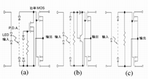 在該電路中,與輸入LED進(jìn)行光耦合的光電二極管陣列,接受輸入信號(hào)發(fā)光產(chǎn)生的光電流,通過(guò)偏置電阻使N.C.元件處于開(kāi)放狀態(tài)。這樣同時(shí)具備(c)電路中第2光電二極管陣列的作用。