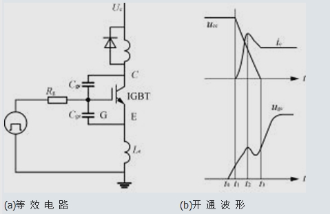在t0時刻,柵極驅動電壓開始上升,此時影響柵極電壓uge上升斜率的主要因素只有Rg和Cge,柵極電壓上升較快。在t1時刻達到IGBT的柵極門檻值,集電極電流開始上升。從此時開始有2個原因導致uge波形偏離原有的軌跡。