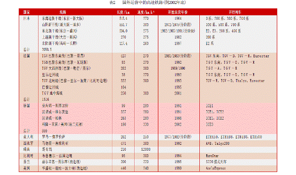 現(xiàn)在,越來越多的國家已經(jīng)擁有了或者正在或者準(zhǔn)備建設(shè)高速鐵路。截至2003 年底,世界上時速超過250km的高速鐵路運(yùn)營里程已達(dá)到5 900km,還有近3 000km高速鐵路在建。計劃到2015年,世界上擁有高速鐵路的國家和地區(qū)將達(dá)到23個,總里程會達(dá)到30 000km,歐洲地區(qū)將形成高速鐵路網(wǎng)聯(lián)通。表2所列的是到2002年底國外正在運(yùn)營的高速鐵路概括。