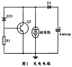 本系統(tǒng)中的充電電路由防過壓和防反充電路構成,圖1所示為其充電電路,圖中的ZD1為5.6V穩(wěn)壓二極管,當電池電壓高于5.6 V時,Q2導通,硅電池全部電流通過電阻Q2消耗掉,當硅電池電壓降到5.6 V以下時,Q2截至,硅電池給超級電容充電,并同時保護超級電容。