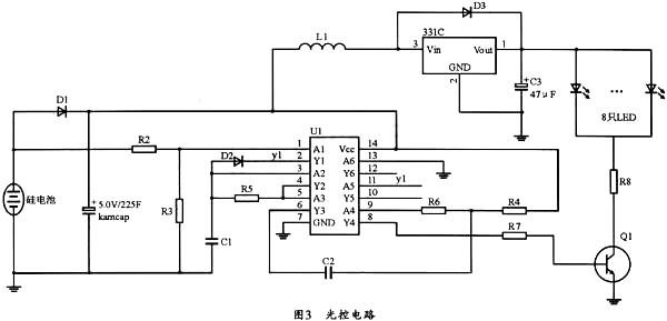 圖3中,U1為帶施密特觸發(fā)器的六反相器74HC14,其中的多諧振蕩器由第二個反相器與R5和C1構成。這樣,在白天光線變亮時,太陽能電池電壓升高,74HC14的1腳為高電平,74HC14的2腳為低電平,8腳同樣輸出低電平,三極管Q1截至,LED關斷。而當光線變暗時,太陽能電池電壓降低到一定程度時,HC14的1腳為低電平,HC14的2腳為高電平,多諧振蕩器開始振蕩,并經過Y4輸出高、低電平,Q2時而導通時而截至,此時只要調節(jié)R6和C1的值,以把閃光頻率調節(jié)到人眼不能分辨即可,這樣做的最大好處是可以延長草坪燈工作時間。經實際測試,該電路可以每天連續(xù)工作10小時以上,完全可以達到用戶的使用需求。