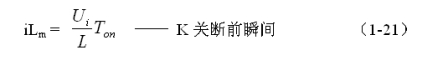 式中i(Ton+)為控制開關(guān)K從Ton轉(zhuǎn)換到Toff的瞬間之前流過電感的電流,i(Ton+)也可以寫為i(Toff-),即:控制開關(guān)K關(guān)斷或接通瞬間,之前和之后流過電感L的電流相等。實際上(1-23)式中的i(Ton+)就是(1-21)式中的iLm,即: