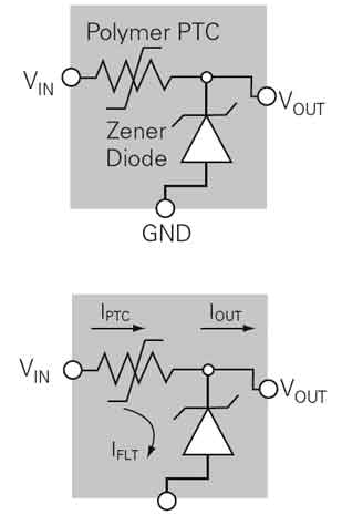在正常工作時,VIN輸入電壓高于齊納二極管的擊穿電壓VZ,有IFLT電流經(jīng)齊納二極管到地,VOUT輸出穩(wěn)定的電壓。有不正常的過壓輸入 VIN時,則齊納二極管的IFLT會產(chǎn)生過流,當(dāng)器件上有過流時,其電阻由低阻態(tài)瞬變到高阻態(tài),使在其上的壓降大增,VOUT輸出基本不變,而流過齊納二極管的電流IFLT反而減小,如圖16所示。器件上電壓降的增大既保護了齊納二極管,又保護了下游的電路。另外,若被保護的下游電路中存在有局部短路或短路故障時,IOUT會增加,PPTC元件由低阻態(tài)變成高阻態(tài),可使電路得到過流保護。