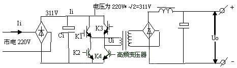 由電路可以看出,市電經(jīng)整流濾波后變?yōu)?11V高壓,經(jīng)K1~K4功率開(kāi)關(guān)管有序工作后,變?yōu)槊}沖信號(hào)加至高頻變壓器的初級(jí),脈沖的高度始終為311V。當(dāng)K1,K4開(kāi)通時(shí),311V高壓電流經(jīng)K1正向流入主變壓器初級(jí),經(jīng)K4流出,在變壓器初級(jí)形成一個(gè)正向脈沖。