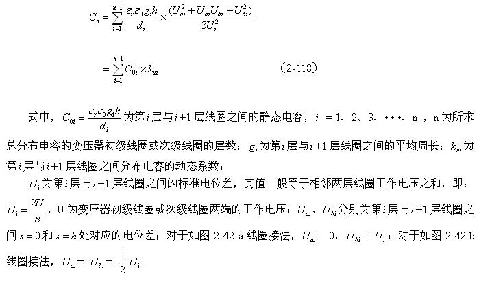 對(duì)于圖2-42-b,可求得變壓器初級(jí)或次級(jí)兩層線圈之間的分布電容為: