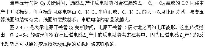 圖2-47中的D1、R1、C1是抑制漏感以及勵(lì)磁電感產(chǎn)生反電動(dòng)勢(shì)和振鈴電壓幅度的有效電路。當(dāng)變壓器初級(jí)漏感以及勵(lì)磁電感產(chǎn)生反電動(dòng)勢(shì)時(shí),反電動(dòng)勢(shì)通過二極管D1對(duì)電容器C1進(jìn)行充電,相當(dāng)于電容器把反電動(dòng)勢(shì)的能量吸收掉,從而降低了反電動(dòng)勢(shì)和振鈴電壓的幅度。