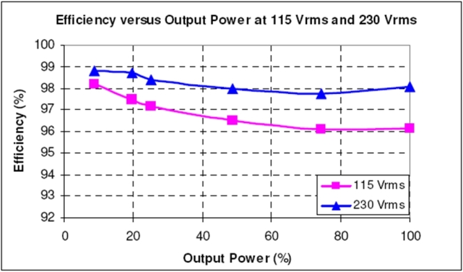 經(jīng)測(cè)試,這原型在90Vrms、滿(mǎn)載、無(wú)風(fēng)扇(機(jī)箱打開(kāi),室溫)條件下的能效達(dá)94%,而在100Vrms時(shí)達(dá)95%。在20%負(fù)載時(shí)能效更接近或超過(guò)96%。這種無(wú)橋PFC架構(gòu)將是適合大功率應(yīng)用的一種極高能效的解決方案。