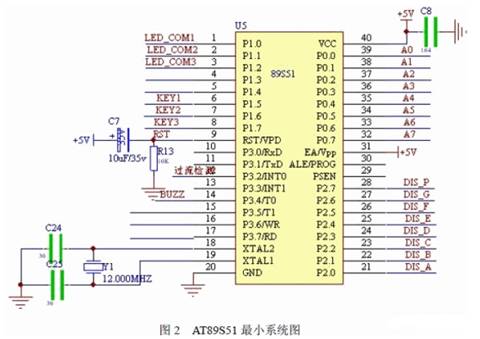主要由AT89S51 最小系統(tǒng)控制,它要完成鍵盤控制、預(yù)置電壓顯示控制、短路保護控制 及報警控制等功能。AT89S51 最小系統(tǒng)如圖2 所示。