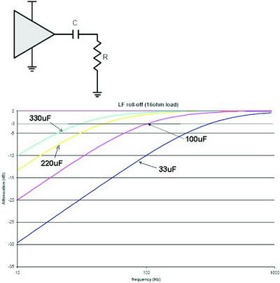 該隔直電容會和耳機(jī)阻抗形成一個高通濾波器,理想條件下該高通濾波器的3dB低頻截止頻率為1/2πRC(R為耳機(jī)的阻抗,C為隔直電容的容值)。為了改善耳機(jī)低頻音效,我們希望此高通濾波器的低頻截止頻率越低越好,但由于耳機(jī)的阻抗是固定的,為獲得更好低頻響應(yīng)唯一可以改變的就是電容容值,所以一般用于耳機(jī)輸出的隔直電容容值都很大,圖1所示為選擇不同容值的隔直電容時形成的高通濾波器頻響曲線。
