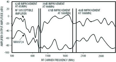 圖6Maxim公司的耳機(jī)驅(qū)動器MAX9724極大提升了抗射頻解調(diào)能力