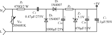 輸入電路的電阻R1(或R1、R2)要采用品質(zhì)較好的金屬膜電阻或水泥電阻,功率2~5W,阻值100~820Ω;降壓電容C2(或C5)采用高質(zhì)量的高壓金屬化聚丙烯電容,一般0.22~0.47μF,耐壓應(yīng)≥AC250V,電容的容量過大會引起視在功率超標。
