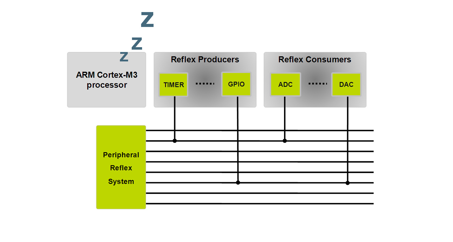 圖4. 使用Energy Micro的''''''''''''''''''''''''''''''''外圍設(shè)備反射系統(tǒng)'''''''''''''''''''''''''''''''' - 一個復(fù)雜的互連矩陣—完成簡單任務(wù)如開展數(shù)據(jù)轉(zhuǎn)換和存儲可執(zhí)行結(jié)果、完全喚醒32位處理器內(nèi)核。