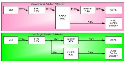 圖6以150WLCDTV電源為例來對比傳統(tǒng)方案與昂寶電子方案,假設(shè)背光滿載消耗100W,其它部分滿載消耗50W,按照常規(guī)架構(gòu)及各模塊轉(zhuǎn)換效率來推算,運(yùn)用傳統(tǒng)方案來設(shè)計(jì),其理論輸入功率將達(dá)到197W左右,整體效率為76%,而使用昂寶電子的方案來設(shè)計(jì),理論輸入功率只需要174W左右,整體效率高達(dá)86%。