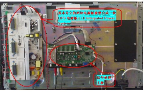 圖2:傳統(tǒng)式LCDTV內(nèi)置信號處理、AC/DC電源、DC/AC電源三塊PCB板。