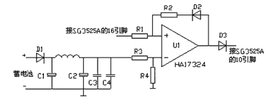 如圖5所示,D1為蓄電池極性反接保護。SG3525A的引腳16輸出參考電壓5V,取R3=R4=10kΩ。在正常情況下,U1的反相輸入端電壓大于正向輸入端電壓,U1輸出低電平,二極管D1、D2截止。當蓄電池電壓低于10V時,比較器U1開始工作,輸出由低電平變?yōu)楦唠娖?,D2、D3導通,并把同相輸入端電位提升為高電平,使得U1一直穩(wěn)定輸出高電平,向SG3525A的引腳10輸出關斷信號。