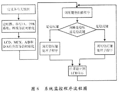軟件部分的設計包括A/D轉換器、D/A轉換器、LCD顯示器、鍵盤系統(tǒng)等功能的子程序,還包含系統(tǒng)監(jiān)控程序和各種中斷服務程序等,其系統(tǒng)監(jiān)控程序流程圖如圖6所示。