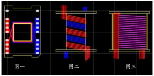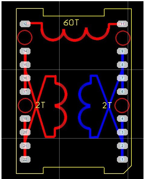 先用5根0.93線繞2圈(見圖二中紅線),中間留空隙,再在空隙處用另外5根線繞2圈(見圖二中藍線),每根線長約37CM。用同樣的方法繞二層,層間包二層膠帶,這樣就相當于用了10根線并繞。繞完低壓繞組,在繞組外用高溫膠帶包三層。繞低壓繞組要注意的問題是:線頭留在下面,即骨架引腳處,線尾留長一點,暫時留在骨架的上面(等繞完高壓繞組后要向下折下來)。從(圖一)可以看出,實際上,低壓繞組的頭和尾是有一段是重疊的,也就是不是2圈,而是約2.2圈,這樣做可以大大減少漏感。