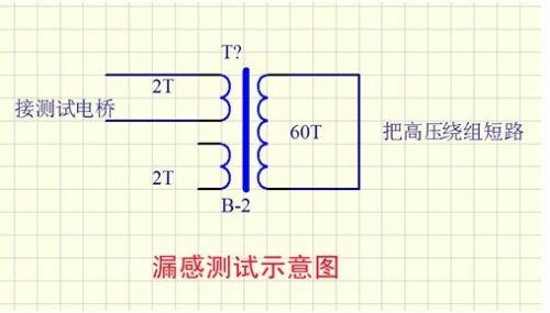 我發(fā)現(xiàn)用這種方法繞制的變壓器漏感比較小。以前用銅帶繞制,漏感一般在0.8uH以上,現(xiàn)在可以做到0.4uH以下。我想原因是:因為銅帶要焊引出線頭,這樣就留下了一個錫堆,再繞高壓繞組時,中間就有一個空隙,導致耦合不緊。下圖為測試漏感示意圖。