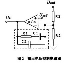 輸出電壓Uout在作為控制取樣信號時,通常經(jīng)過圖2所示的電路進(jìn)行處理,得到電壓信號Ue,Ue再經(jīng)處理或直接送入PWM控制器。圖2中電壓運(yùn)算放大器(e/a)的作用有三: