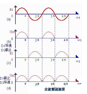 這種除去半周、圖下半周的整流方法,叫半波整流。不難看出,半波整說是以"犧牲"一半交流為代價(jià)而換取整流效果的,電流利用率很低(計(jì)算表明,整流得出的半波電壓在整個(gè)周期內(nèi)的平均值,即負(fù)載上的直流電壓Usc=0.45e2)因此常用在高電壓、小電流的場(chǎng)合,而在一般無線電裝置中很少采用。