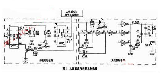 無(wú)線發(fā)射電路:電路由左邊延時(shí)部分觸發(fā)接通。電路由CD4069六反相器中的A、B、電阻R5、晶振組成高頻振蕩器,C、D、E、F分別組成整形及驅(qū)動(dòng)電路,信號(hào)經(jīng)三極管9018放大,再經(jīng)L2、C1、C4諧振后向空中發(fā)射。