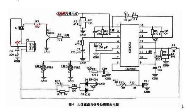電路主要包括了電源電路、人體熱釋電紅外線傳感器、信號(hào)處理芯片、控制及執(zhí)行電路等部分。電源電路通過(guò)阻容(R15和C12)降壓,并經(jīng)過(guò)D1、D2整流,將220 V交流電轉(zhuǎn)換成可供芯片及外圍電路工作的低壓直流電(4.0 V~5.5 V)。CSC9803芯片工作電壓為直流4.O V~5.5 V,內(nèi)置穩(wěn)壓3.1 V輸出直接驅(qū)動(dòng)PIR管。人體紅外釋熱傳感器PIR探頭感應(yīng)到信號(hào)經(jīng)CSC9803芯片內(nèi)部放大,若判斷有觸發(fā),運(yùn)放輸出高電平,防止誤觸發(fā)。控制信號(hào)由 芯片的11腳輸出,經(jīng)三極管放大控制雙向可控硅導(dǎo)通,從而控制外部交流接觸器或繼電器電磁線圈持續(xù)接通。