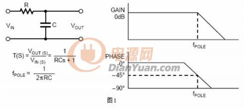 數(shù)學上,在傳輸方程式中,當分母為零時會產(chǎn)生一個極點。在圖形上,當增益以20dB每十倍頻的斜率開始遞減時,在博得圖上會產(chǎn)生一個極點。圖1舉例說明一個低通濾波器通常在系統(tǒng)中產(chǎn)生一個極點。其傳輸函數(shù)和博得圖也一并給出。