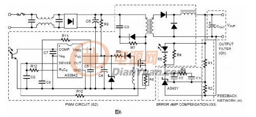 用經(jīng)典環(huán)路控制分析方法,開關調(diào)整器的控制環(huán)分為四個主要部分:輸出濾波器,PWM電路,誤差放大器補償和反饋。圖5用方塊圖舉例說明這四部分,圖6舉例說明一個開關電源電路圖。