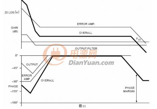 因為這是一個線性系統(tǒng),可以用疊加的方法得到整個系統(tǒng)的傳輸函數(shù)。通過把整個環(huán)路各部分的增益和相位疊加起來,產(chǎn)生整個系統(tǒng)的博得圖。通過放置補償網(wǎng)絡的極點和零點使系統(tǒng)的性能最優(yōu)化。圖11把各部分的博得圖結合起來,負反饋系統(tǒng)的180度相移也加入進來了。