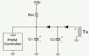 起動電路損耗在電源轉(zhuǎn)換器空載待機損耗中占很高的比例,此處我們介紹一種起動速度快且損耗低的起動電路。圖6(a)為傳統(tǒng)起動電路,其中VSTA是脈寬調(diào)制控制器起始臨界電壓,TD_ON是啟動延遲時間,TD_ON=(C1×VSTA)/IC1。使用較大輸入電阻(Rin)可以有效降低電阻損耗,但啟動延遲時間會延長。因此建議采用圖6(b)電路,其中C1電容較小,這樣在用大輸入電阻時能夠降低起動電路的損耗,同時仍然擁有較快起動速度。較大的C2電容可提供穩(wěn)定的電壓給控制器使用,不會增加起動延遲時間。